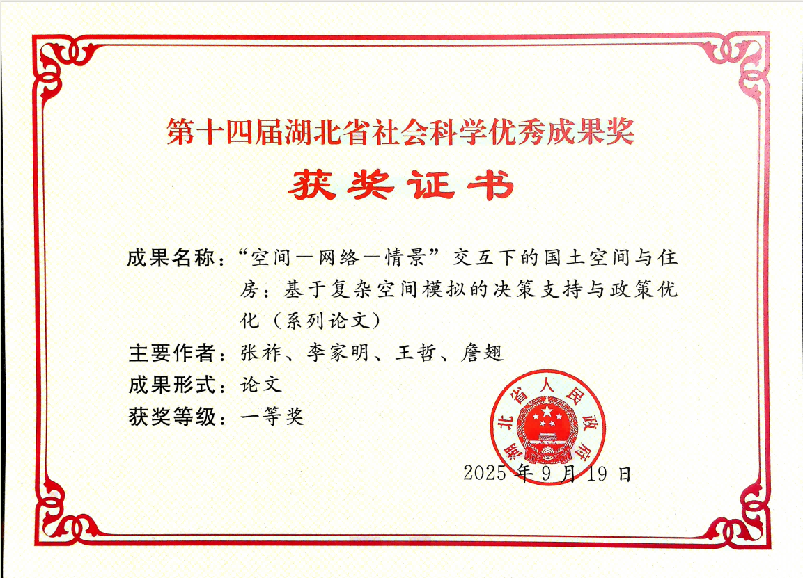 近日,湖北省人民政府发布了《湖北省人民政府关于表彰第十四届湖北省社会科学优秀成果奖的通报》,永业行资源环境事业群开发利用部副总监詹翅博士参与撰写的《“空间一网络一情景”交互下的国土空间与住房:基于复杂空间模拟的决策支持与政策优化(系列论文)》荣获一等奖。